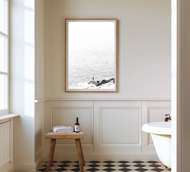 photographie noir et blanc sous cadre et posée au sol, sur le thème de la mer signée emmadaum pour Domaine Singulier
